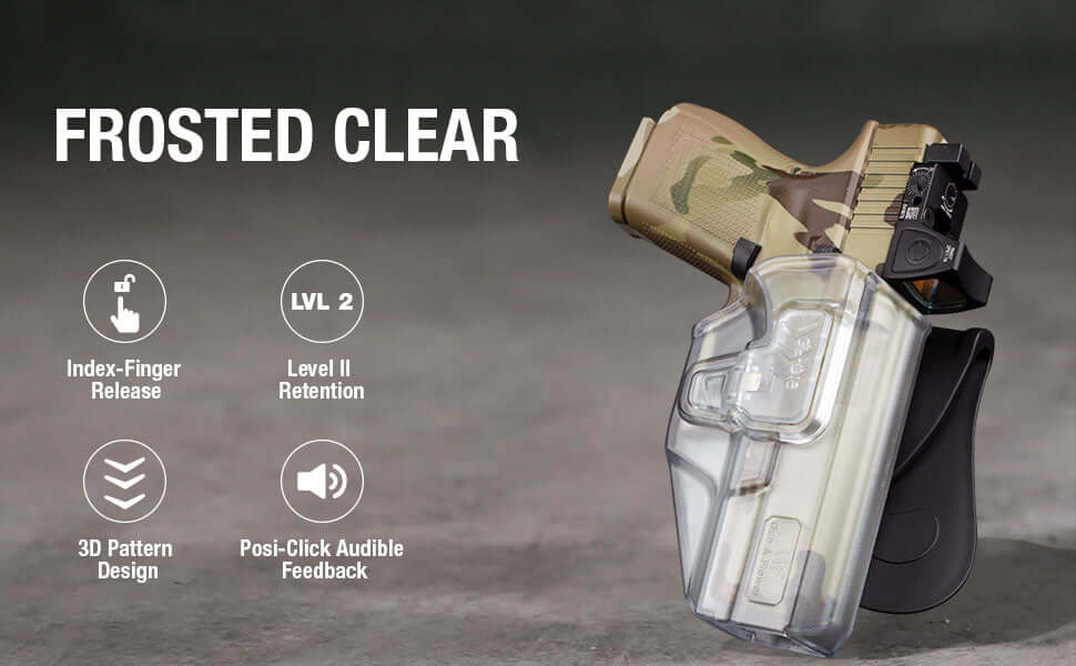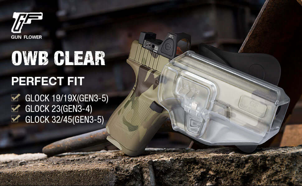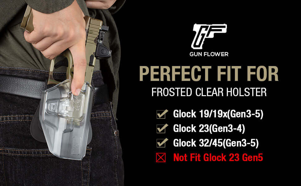Frosted Clear Level II Retention OWB Paddle Holster for Glock 19 19X 32 45(Gen 3 4 5)丨Glock 23(Gen 3 4) Optics Ready,Right Hand | Gun & Flower